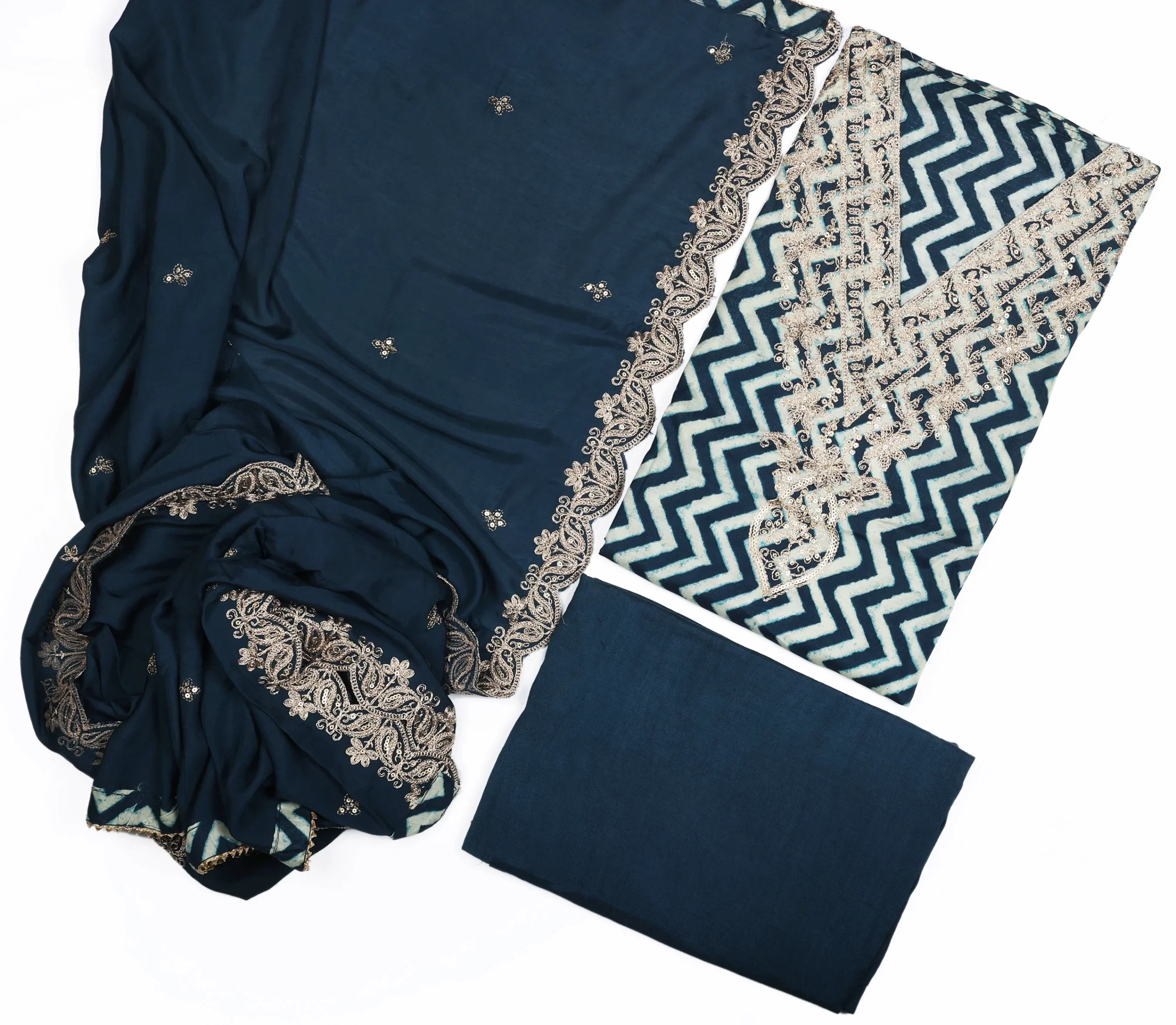 Modal silk beautiful embroidered neck design suit plain bottom with elegant hand work muslin dupatta